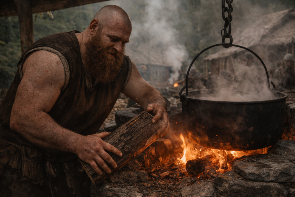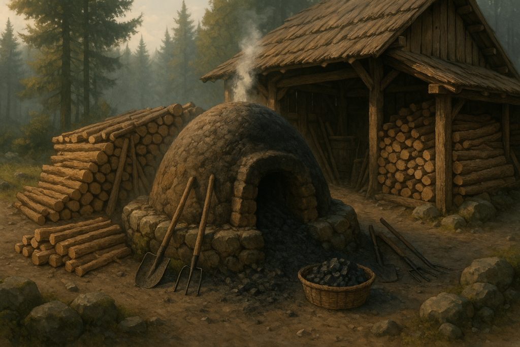 夕方:炭窯の煙、鍛冶場の鉄の匂い。