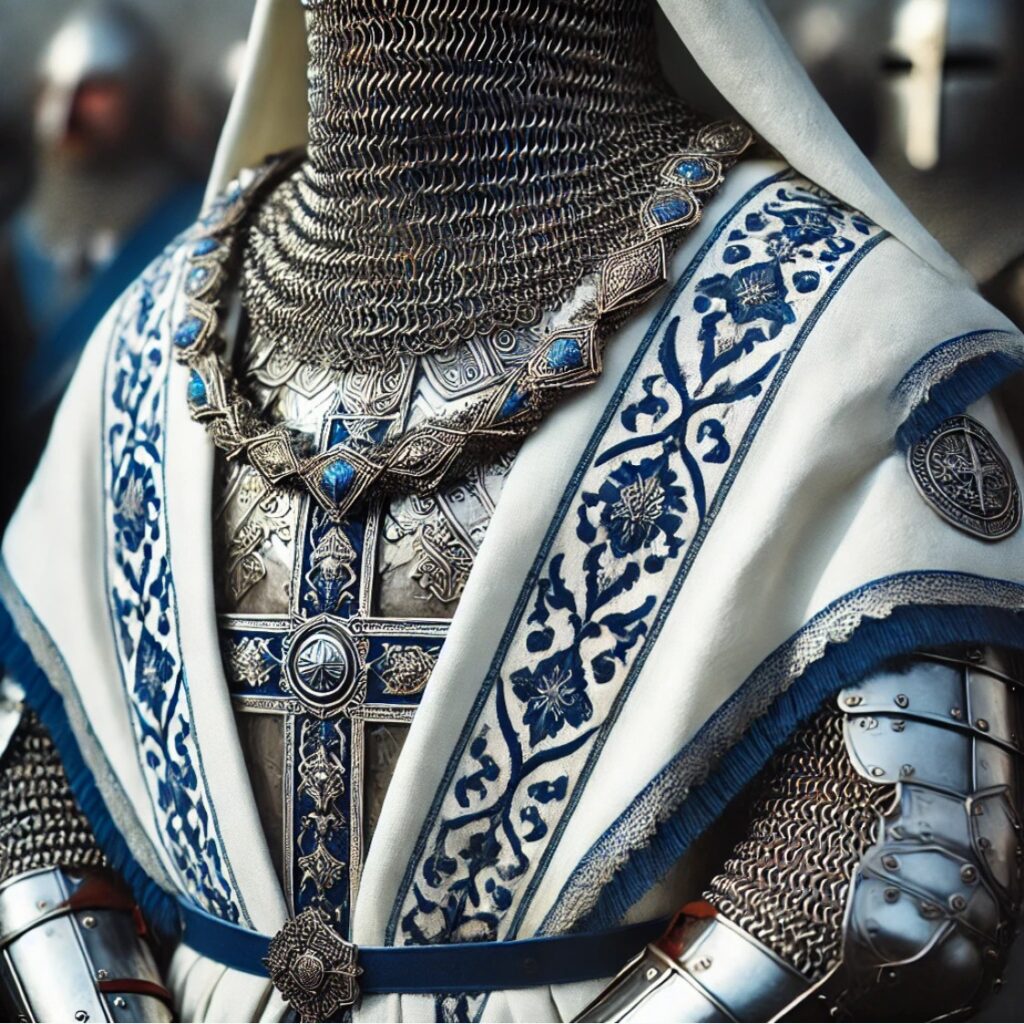 鎧の下に白と青の装飾が施された法衣。法衣は戦いと正義の象徴で、青い刺繍は秩序を意味する。