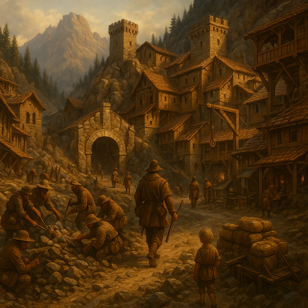 人口約600人程度。粗野な鉱山街。居住区、鉱区、ギルド区域、奴隷居住区、旧鉱区(閉鎖区域)に分かれる。