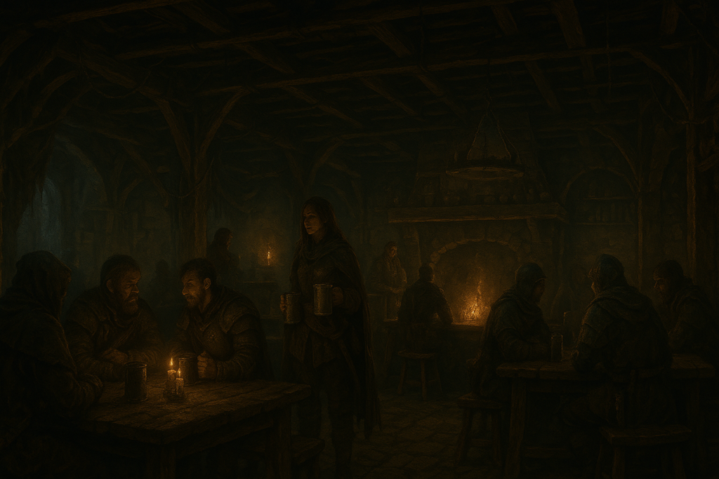 一階: 酒場兼食堂(粗い木のテーブル、酒樽から直接注ぐスタイル)、中央に暖炉、ランタンの光がほのかに揺れる