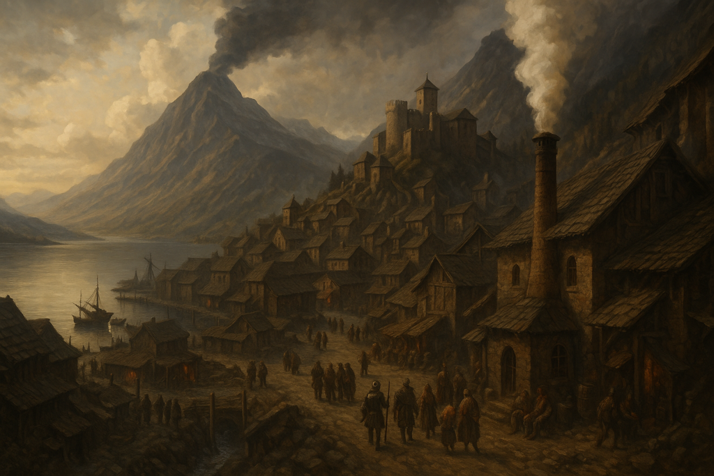 湖側は港と倉庫群が広がり、鉱山側には煙の上がる精錬所や鉱夫の宿舎が立ち並んでいる。