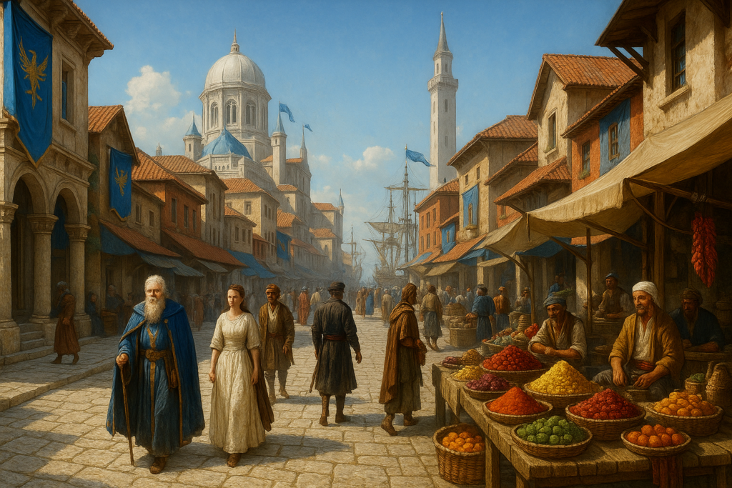 街路には香油や果実の匂いが漂い、夕刻には絹衣と金飾りに身を包んだ貴族たちが王宮前広場に集い、音楽家の演奏を愉しむのが日常だ。