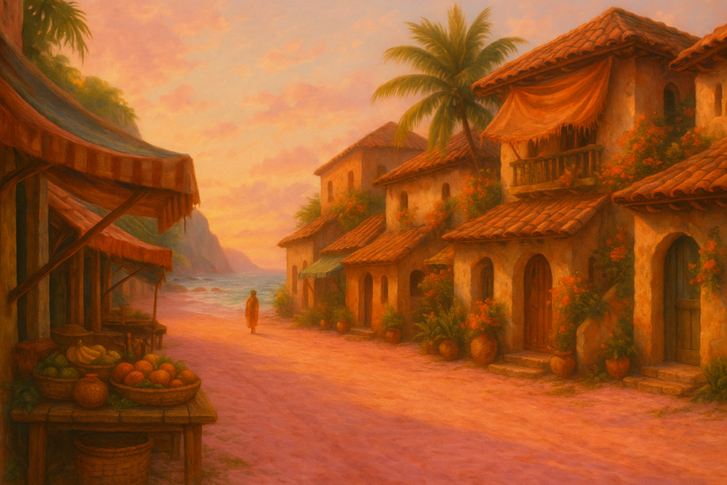 夕刻には、浜辺全体が金色・薔薇色・橙のグラデーションに染まり、