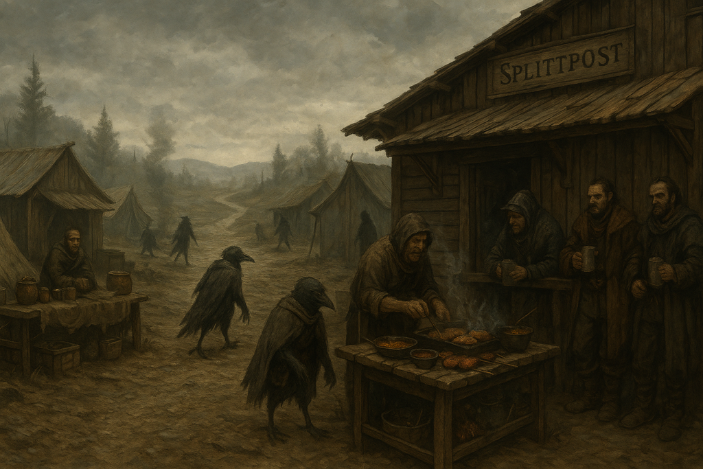 スプリットポストは近くの森から切り出された木でいい加減に建てられた粗末な建物と、商隊や傭兵隊の幕屋、露店が並びます。
