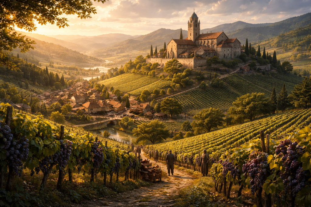 石造りの修道院と圧搾施設が点在し、祈りと労働が自然に結びついた風景が街の基調となっている。