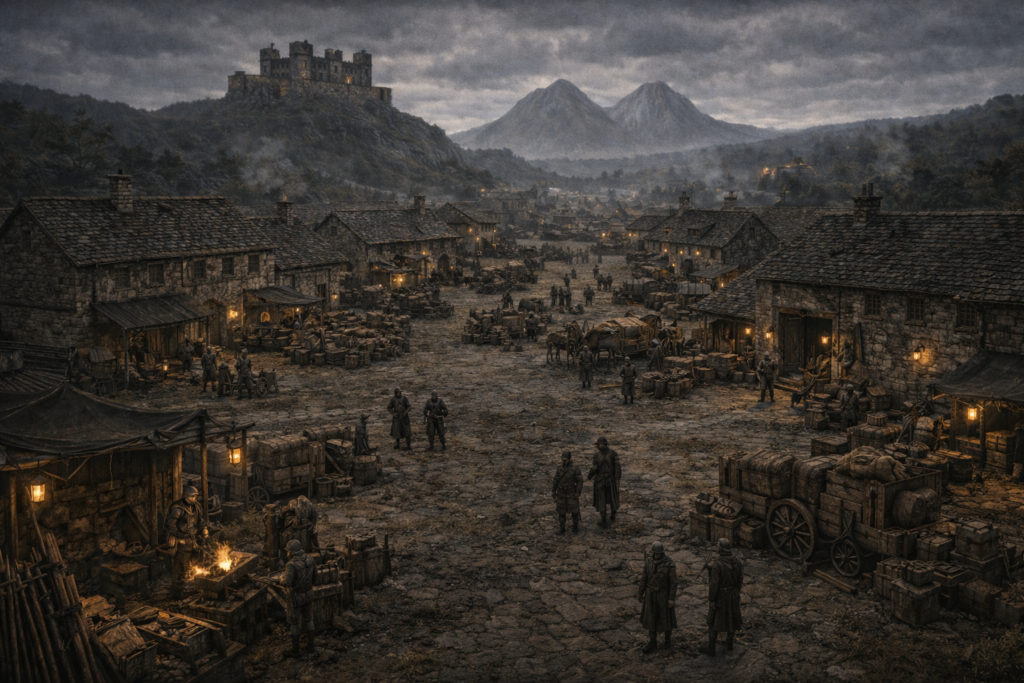 倉庫、鍛冶場、厩舎、兵舎が街の大半を占め、