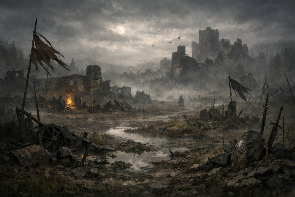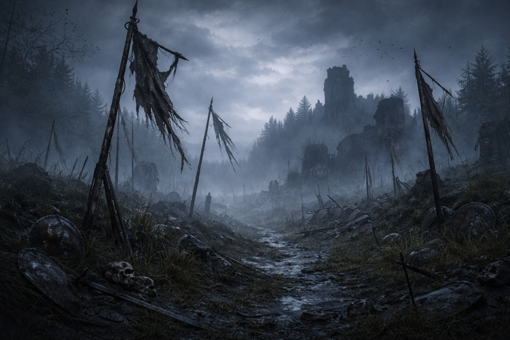 折れた槍、半ば土に沈んだ盾、砕けた石壁。